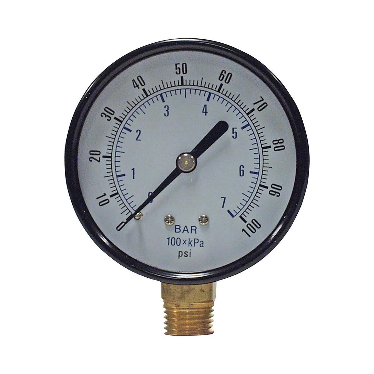 Utility dry pressure gauge for commercial and industrial markets. Constructed with a black steel case, chrome bezel, copper alloy internals, and a brass male national pipe thread lower mount. Meets or exceeds ASME B40.100 pressure gauge standard.