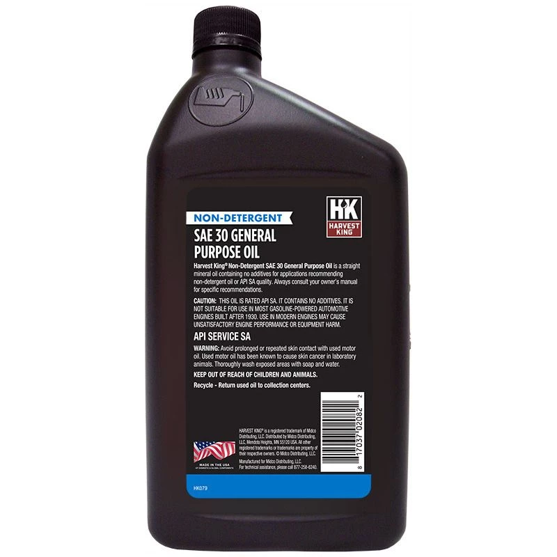 HARVEST KING CONVENTIONAL SAE 30 MOTOR OIL – is formulated to provide engine protection under severe operating conditions. Conventional SAE 30 is made from selected and highly refined base oils compounded to provide protection against wear and corrosion. Helps prevent oxidative thickening and inhibits promotion of engine acids, sludge, and varnish deposits. Follow manufacturers recommendation for viscosity grade and API service category. Meets or exceeds the requirements of API Service SN, SM, SL, and SJ